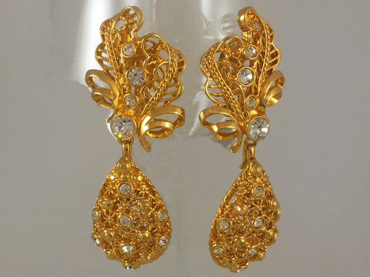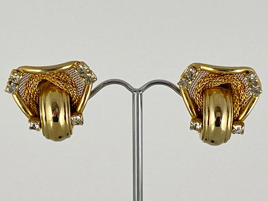 1950s HOBÉ Gold-Toned Earrings with Crystal Cabochons & Gold Mesh Backing