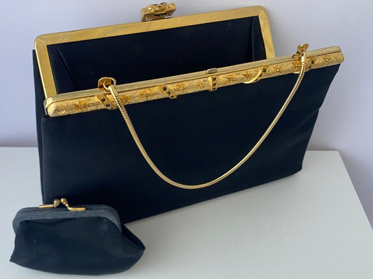 1950s AFTER FIVE Black Satin Clutch with Coin Purse